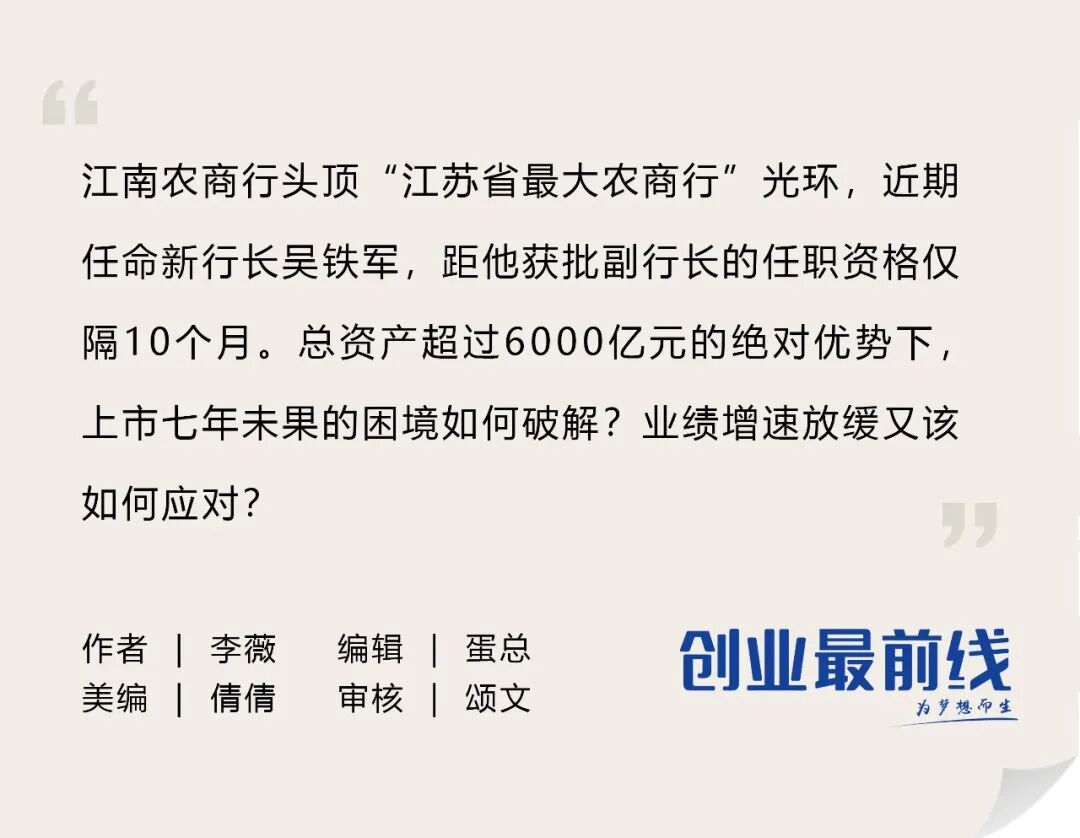有关上市进展以及人均薪酬是否跟随业绩压降等问题,「创业最前线」试图与江南农商行进一步沟通,但截至发稿暂未获得回复。作为江苏省资产规模最大的农商行,江南农商行在新行长吴铁军的带领下,如何实现业绩增长并完善内控合规、公司治理机制,进而登陆资本市场,「创业最前线」将持续关注。