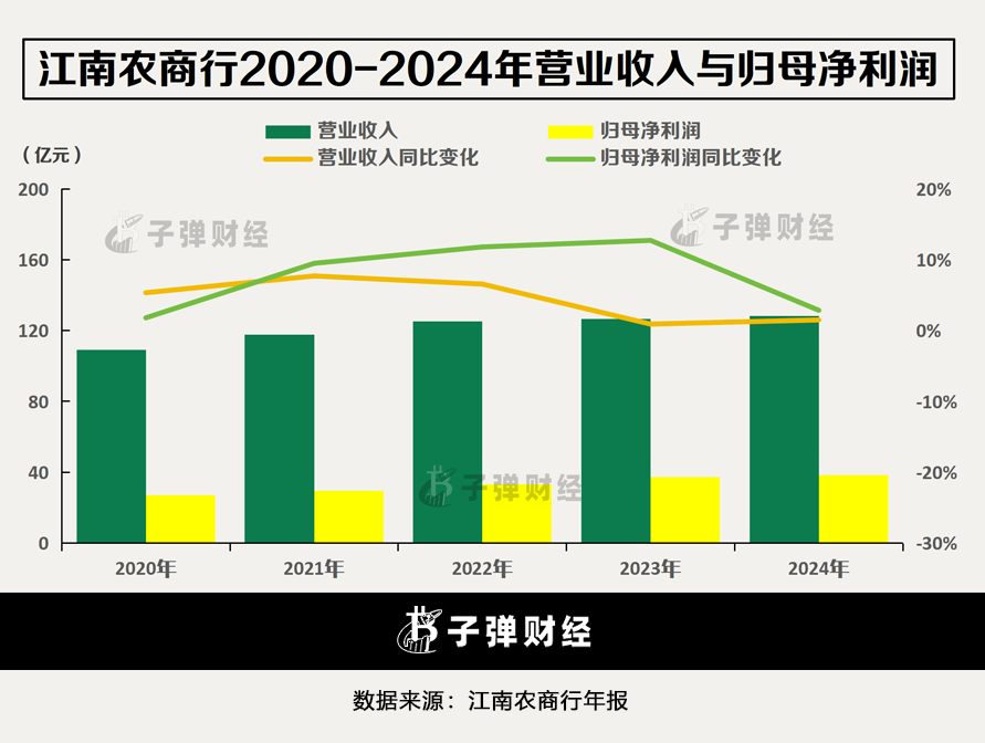 过去五年,江南农商行的业绩是否稳定?2020年至2024年,该行营业收入同比增速分别为5.35%、7.71%、6.56%、0.92%和1.5%,呈现回落态势。