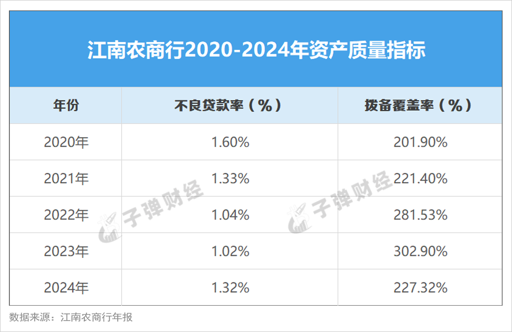 从拨备覆盖率来看,江南农商行从2023年的302.9%降至2024年的227.32%,反映该行的风险抵御能力或发生下滑。