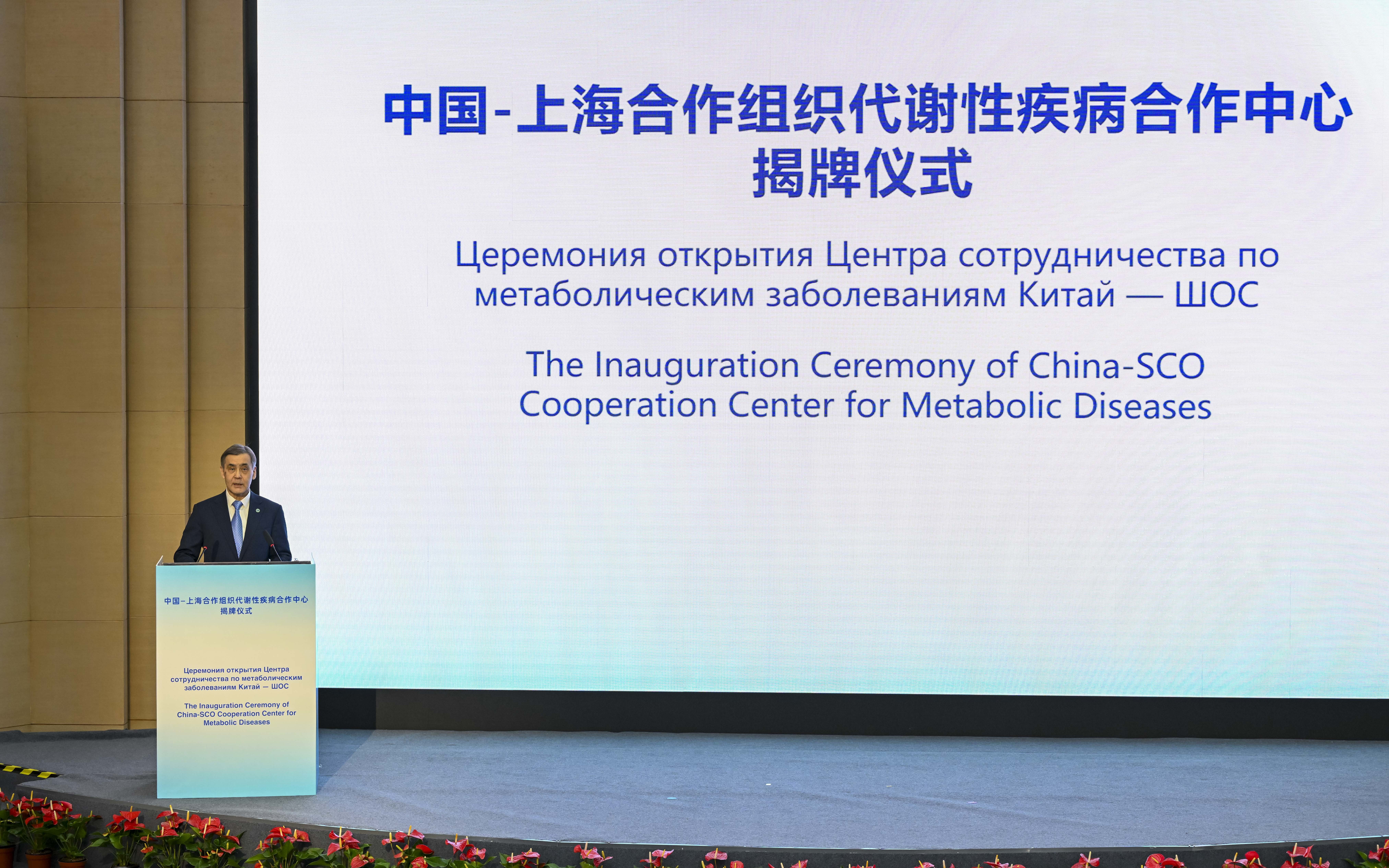 2月27日,上海合作组织秘书长叶尔梅克巴耶夫在中国-上海合作组织代谢性疾病合作中心揭牌仪式上致辞。新华社记者 陈浩明 摄